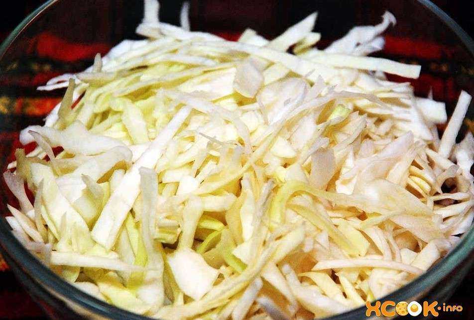 - Капусту нашинкуйте (не слишком мелко), Морковь измельчите на терке с крупными отверстиями. Луковицу порежьте на тонкие четвертинки колец.