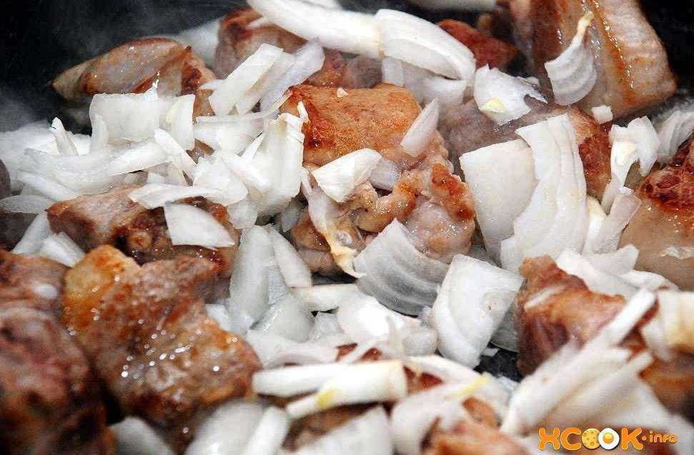 Жарим лук с мясом до мягкости и такой же золотистой корочки.