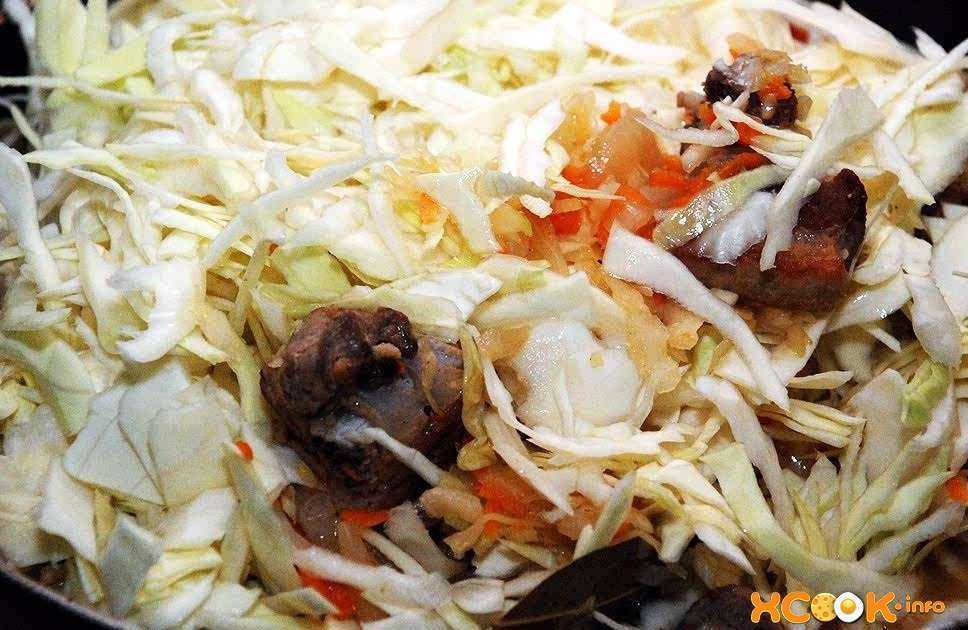 - К овощам выкладываем нашинкованную капусту (свежую и квашеную), кусочки чернослива и немного воды. Все тушим практически до готовности. В конце добавляем в блюдо специи, зелень, томатную пасту, чеснок и держим на огне еще около пяти минут.
