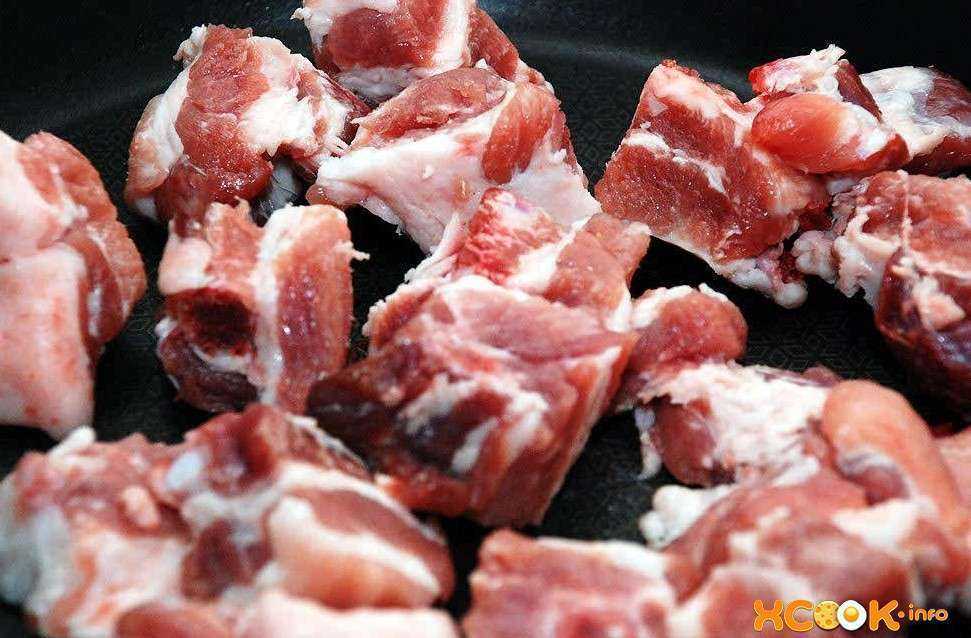 - Свинину нарежьте кубиками размером около 2 см. Если дополнительно используете копченые ребрышки, срежьте мясо с костей.