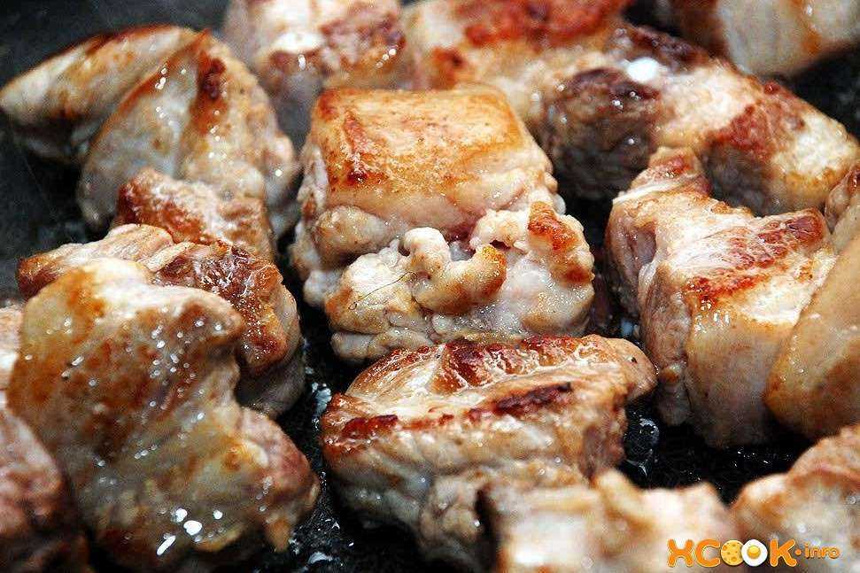 Мясную нарезку отправляем на разогретую сковороду без добавления масла или жира. Обжариваем кусочки свиных ребер со всех сторон.