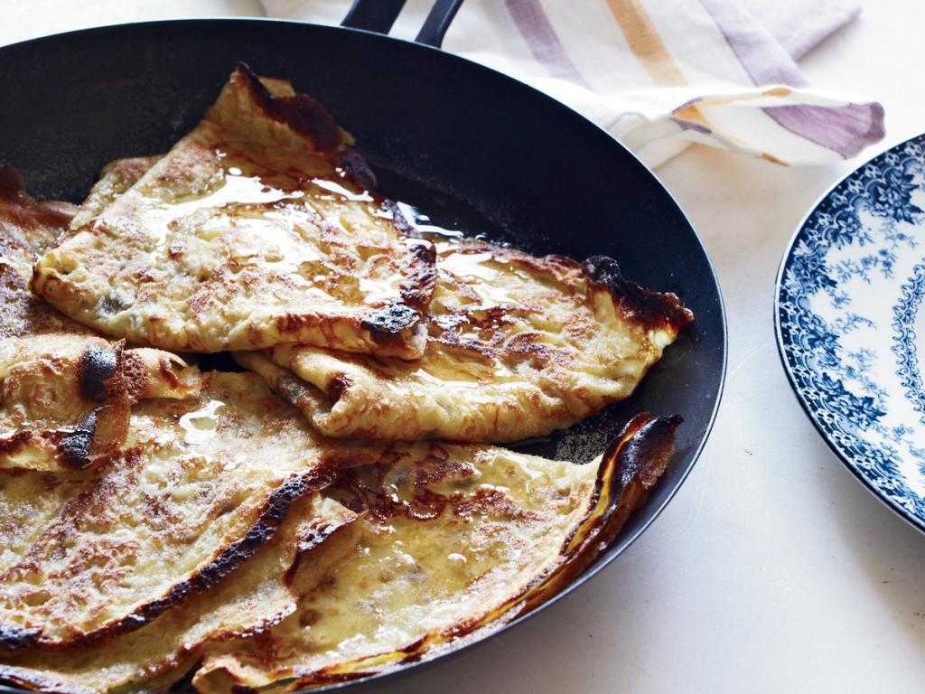 Для выпекания лакомства подойдет сковорода без ручек, которую называют крепницей. Посуда большая и плоская, поэтому она похожа на крупный диск. Однако можно приготовить блины на обыкновенной сковороде, если крепницы нет под рукой. Тесто нужно наливать тонким слоем, чтобы готовые блинчики получились тонкими и вкусными. Переворачивать их нужно аккуратно, чтобы случайно не порвать заготовку.