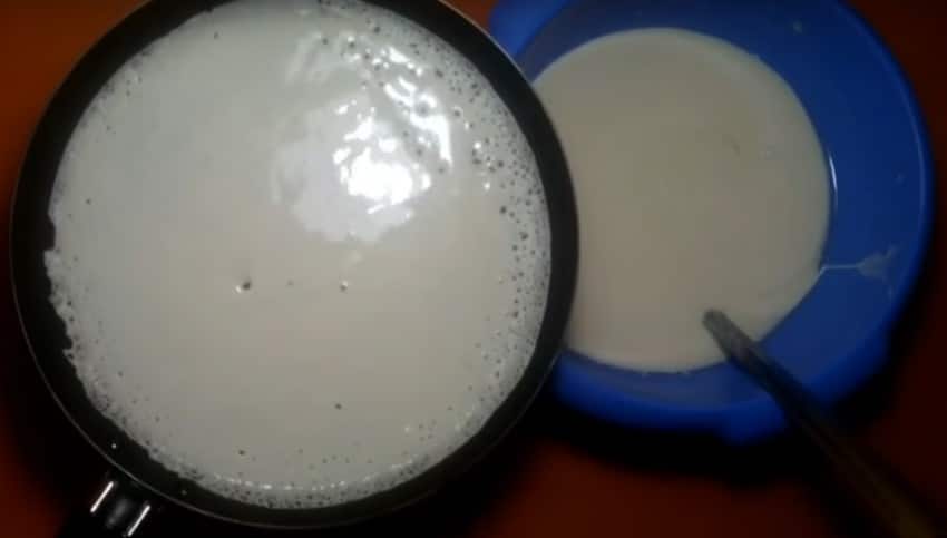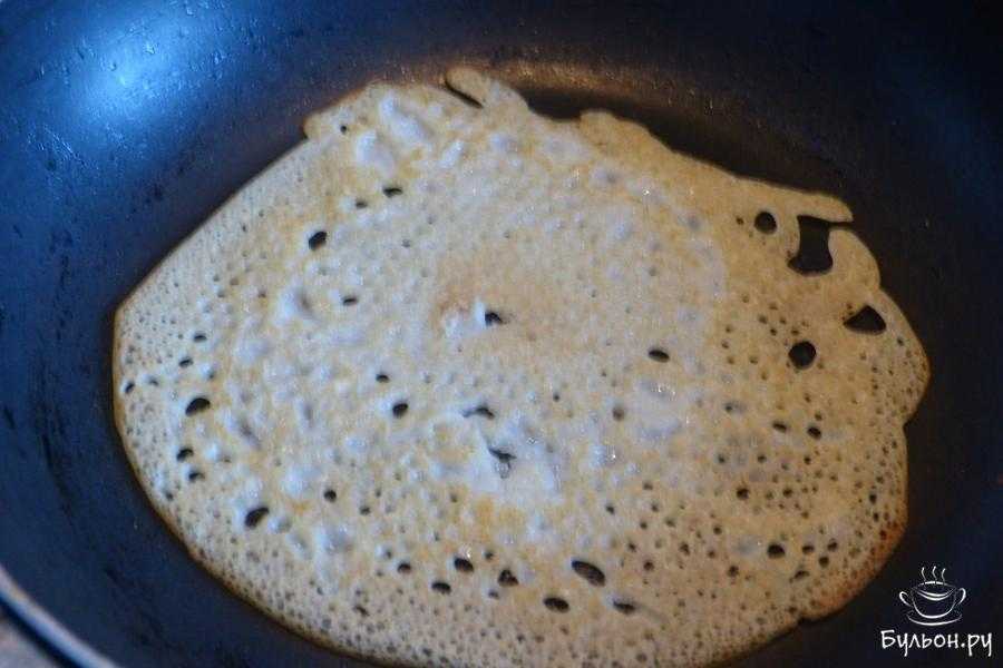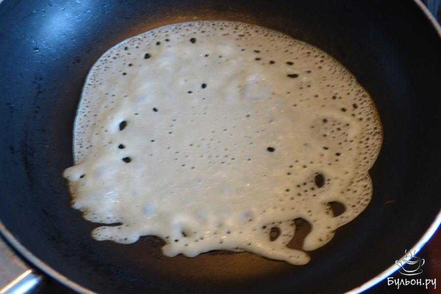 3. Возьмите сковороду с толстым дном, смажьте маслом, хорошо прогрейте. Налейте небольшое количество теста и распределите его по кругу, вращая при этом сковороду.