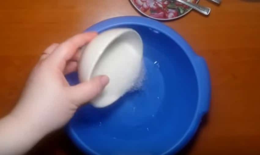 1. В воду комнатной температуры добавьте сахар и соль, помешивайте до полного растворения.
