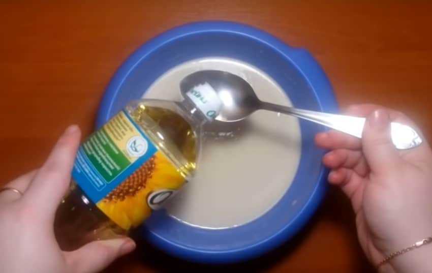 5. Все хорошо вбиваем. Можно использовать электрический венчик или миксер. Затем добавляю рафиринованное растительное масло, оно без запаха, перемешиваю, и даю ему отдохнуть на столе 20 минут.