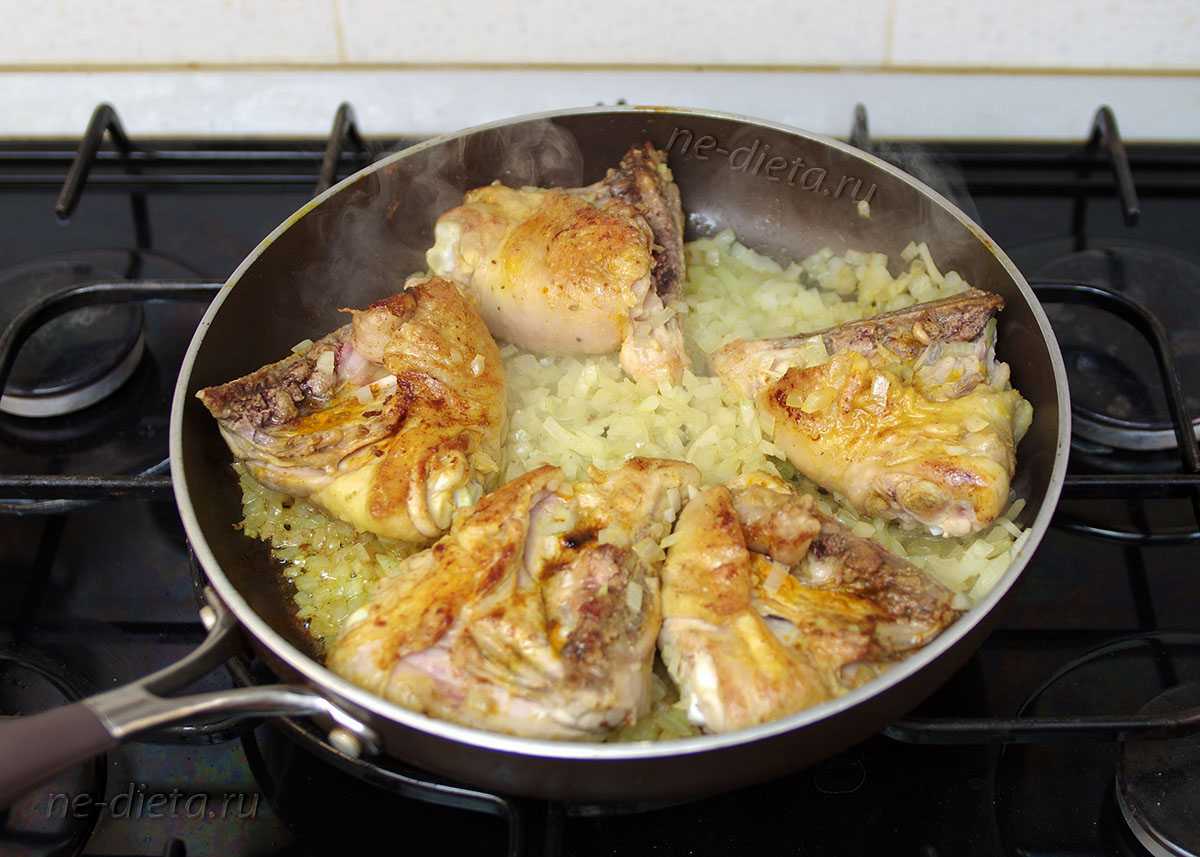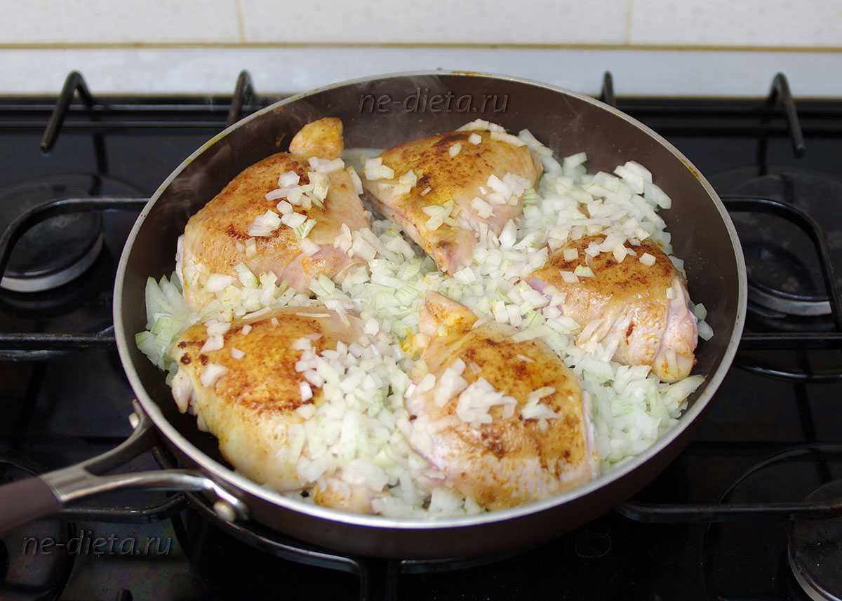 - Сок, который выйдет из курицы, следует слить в отдельную миску. А в сотейник следует добавить порезанный лук. Продолжать блюдо обжаривать уже на масле 10 минут.