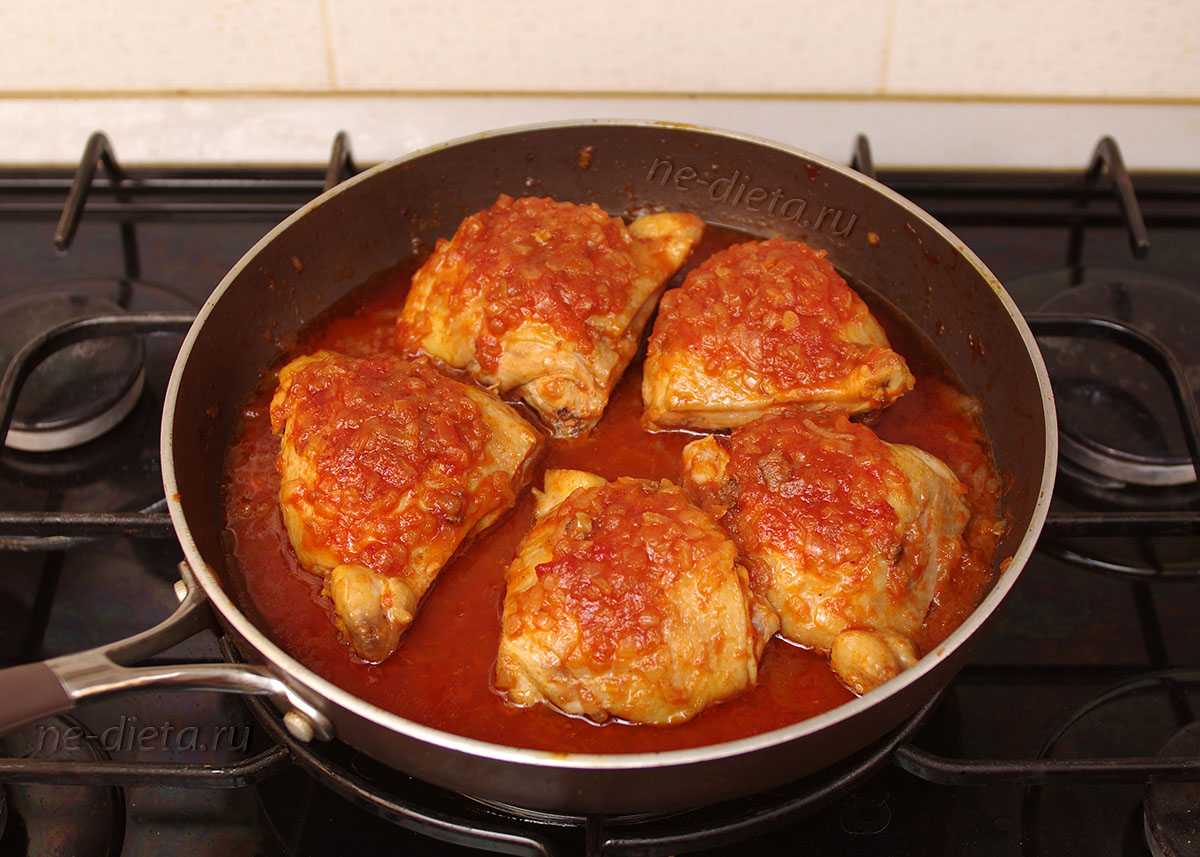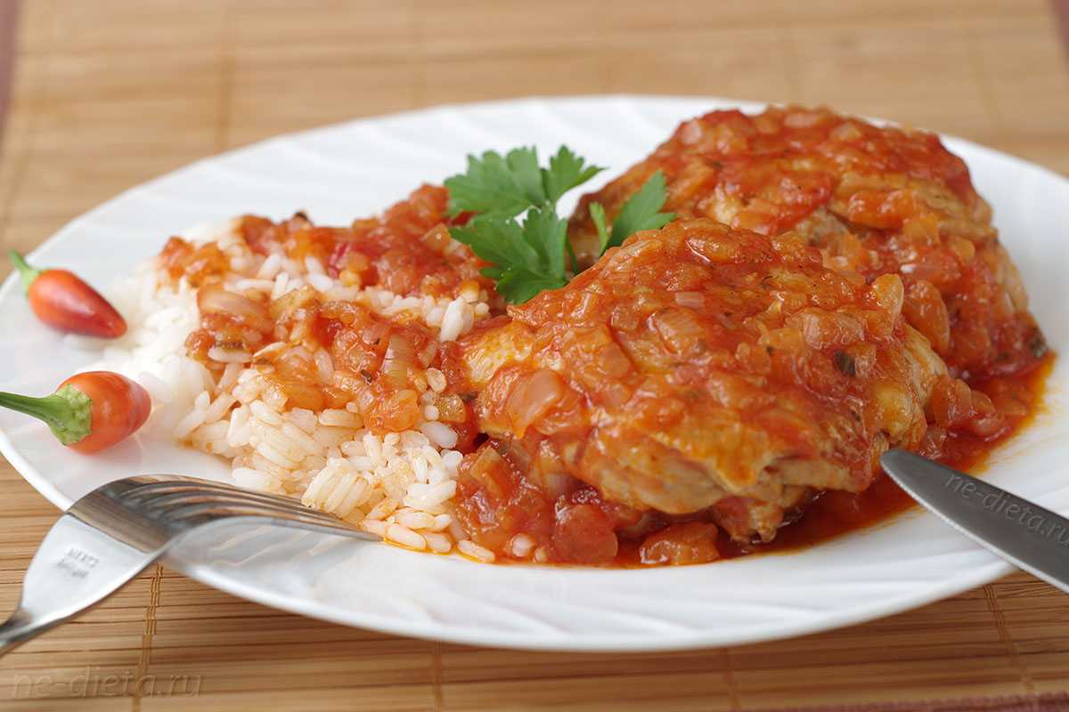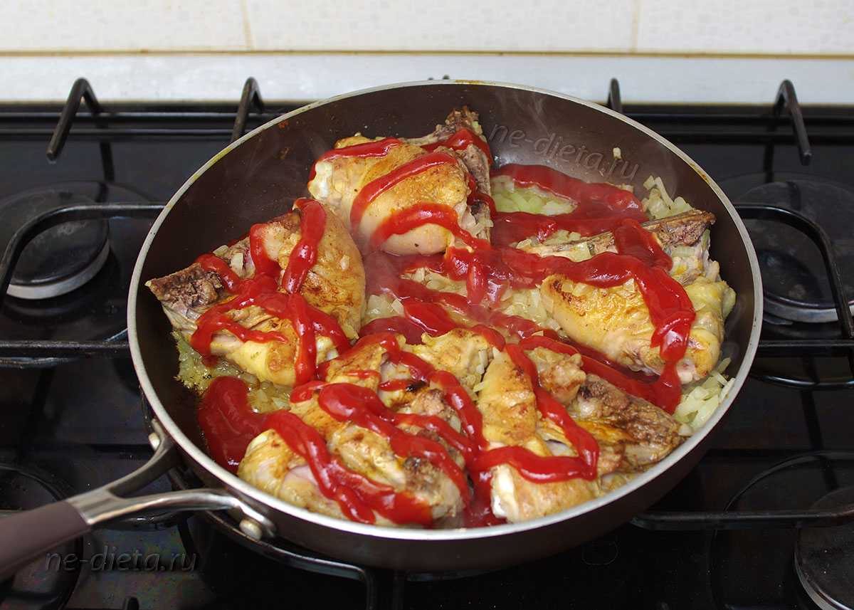 По приведенному выше рецепту получается очень вкусная, но совсем не диетическая курица. Чтобы сделать это блюдо более полезным и менее калорийным, следует, во-первых, взять диетическую часть курицы – грудку, либо использовать окорочка, но срезать с них кожу и лишний жир. В этом случае для обжарки мяса на сковородку придется добавить немного растительного масла. Во-вторых, вместо кетчупа желательно использовать свежие помидоры, снять с них кожуру и нарезать кубиками. Для простоты можно взять банку консервированных резаных томатов в собственном соку.