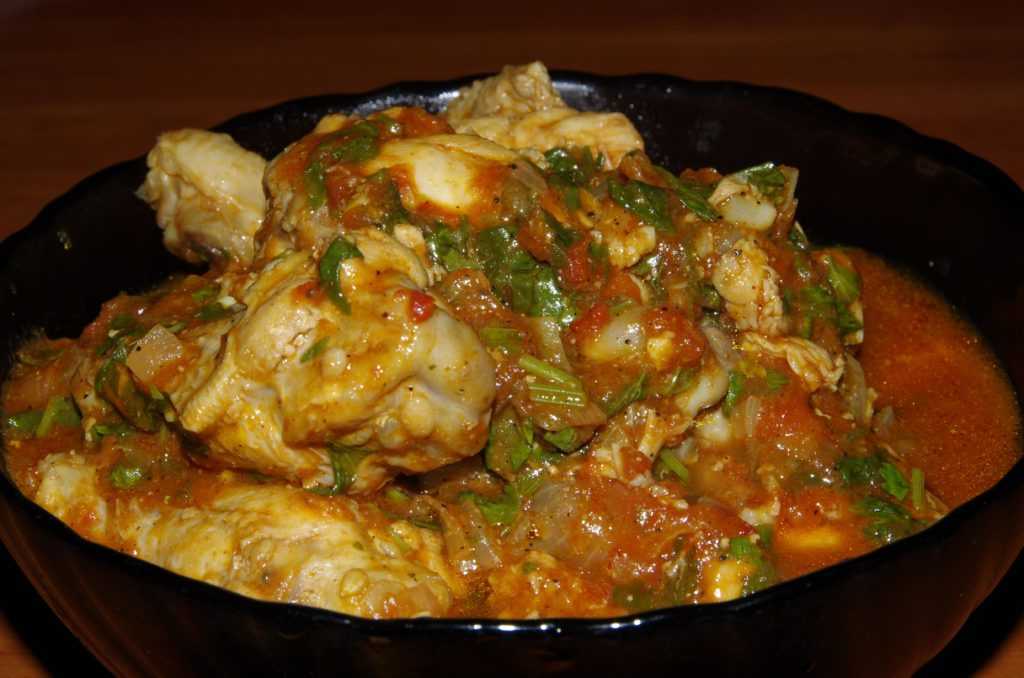 Крупные кусочки курицы обжариваются на сковородке без масла с двух сторон до достижения хрустящей корочки, запечатывая тем самым сок внутри. Затем это мясо тушится с помидорами, другими овощами и душистыми специями.