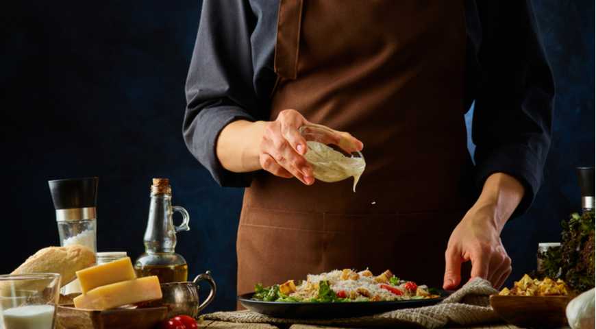 Настоящий соус для салата Цезарь готовят из сырого желтка, чеснока, горчицы, анчоусов, вустерского соуса, лимонного сока, оливкового масла с щедрой порцией пармезана.