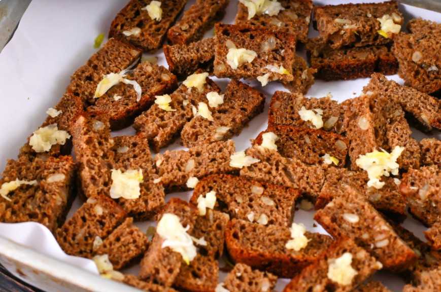 - Хлеб нарежьте кусками по 2-3 см. На сковороде разогрейте 2 столовые ложки масла, обжарьте в нем крупно порезанный чеснок. Потемневший чеснок выбросьте, масло остудите, влейте в пакет, насыпьте в него хлеб. Потрясите пакет, чтобы куски батона покрылись маслом. Высыпьте их на застланный пергаментом противень, отправьте их в духовой шкаф. Подсушите в течение нескольких минут, пока кусочки не начнут подрумяниваться. Выньте противень из духовки, дайте сухарикам остыть.