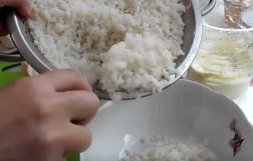 Вначале рис перебираем, отвариваем в большом количестве воды. Откидываем на дуршлаг. Пересыпаем рис в салатницу.
