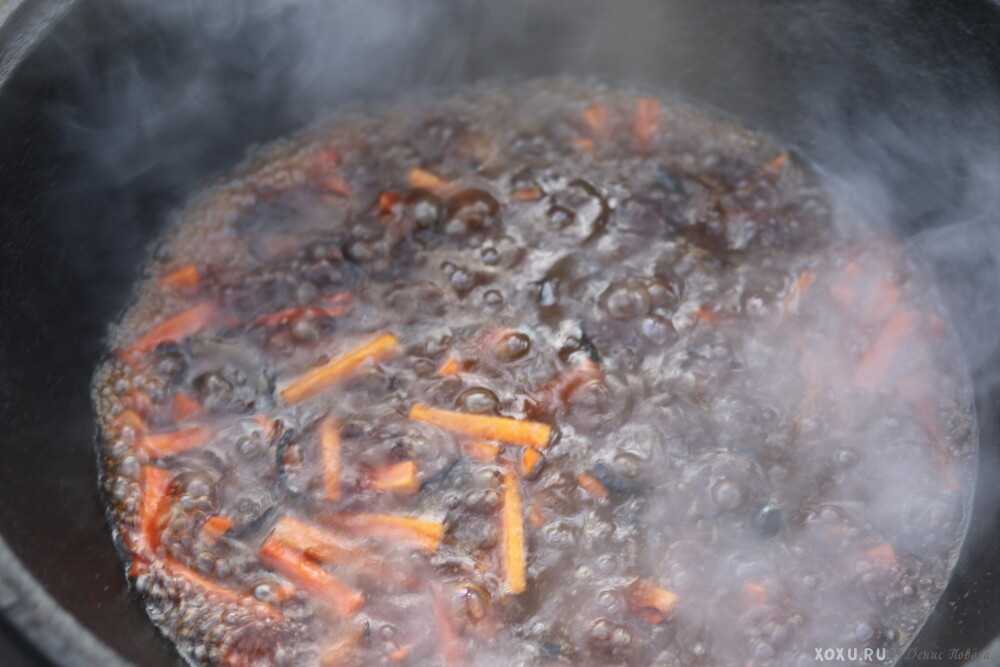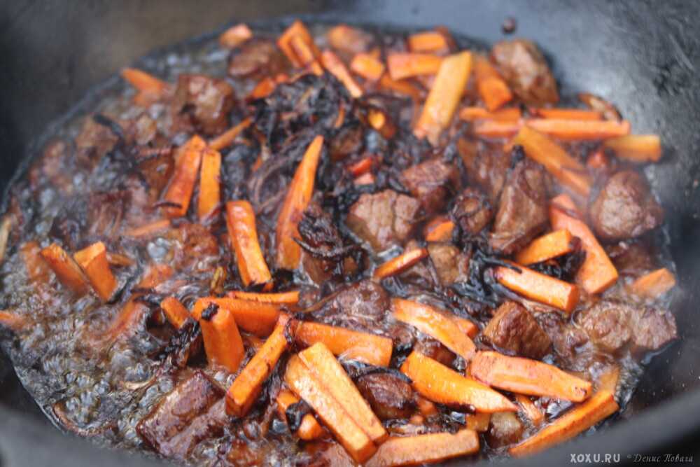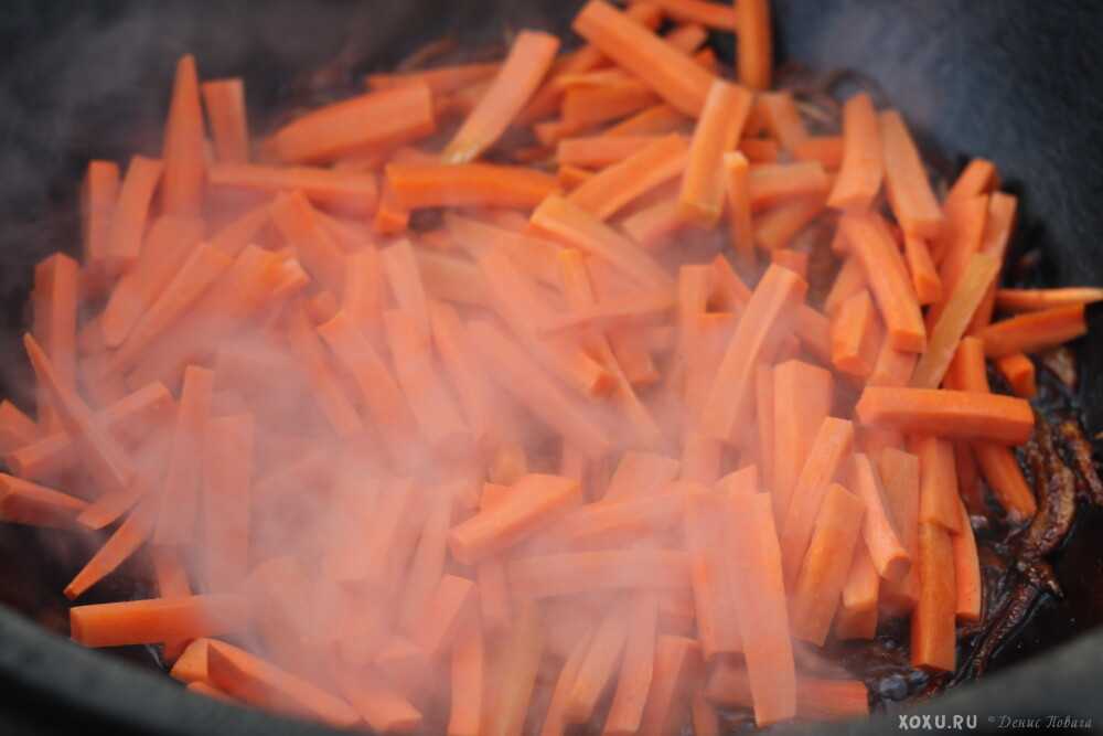 Дальше закидываем морковь и, постоянно помешивая, обжариваем до тех пор, пока она не станет мягкой. Зажарка готова, теперь можно приступать к приготовлению зирвака.