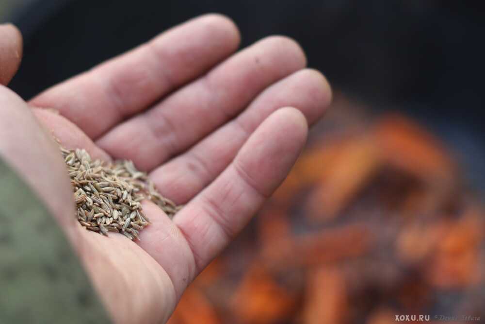 Шаг 6. Добавляем зиру. Можно её добавлять сразу после соли, а можно после моркови. Самое главное, до риса и желательно до воды. Зира раскроет свой вкус и аромат мясу и делает плов более насыщенным. Я не добавляю слишком много этой приправы, потому как не хочется перебивать вкус. Предварительно растираю семена в ладони, чтобы «раскрыть» аромат семян…