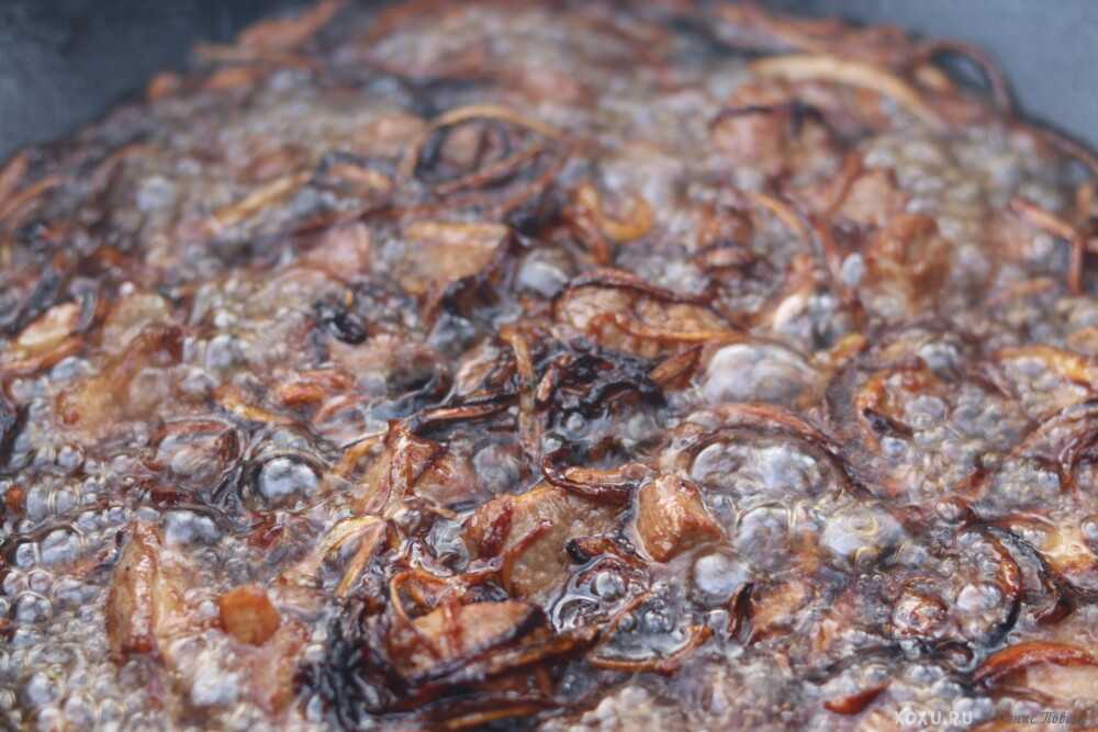 Лук не просто румяним до золотистой корочки. А в буквальном смысле обжариваем до темна. Процесс называется — карамелизация лука. Суть в том, что из лука выделяется сахар при длительной жарке, и этот сахар будет окрашивать и цветом и ароматом и мясо и весь плов в целом. Будет вкусно и ароматно! Самого лука, не будет чувствоваться в плове. Температура в казане высокая. И всё необходимое он передает в зирвак. Даже если где-то подгорит лучок, ничего страшного. Вот посмотрите, у меня он очень темный получился. И плов получился очень вкусным. В прошлом выпуске, готовили по такому же принципу, и в буквальном смысле жгли лук. Аромат разносится по всем соседям. Особенно на следующем этапе, когда отправим мясо….