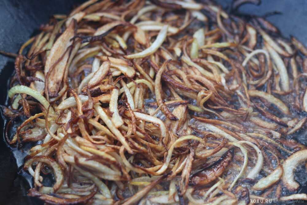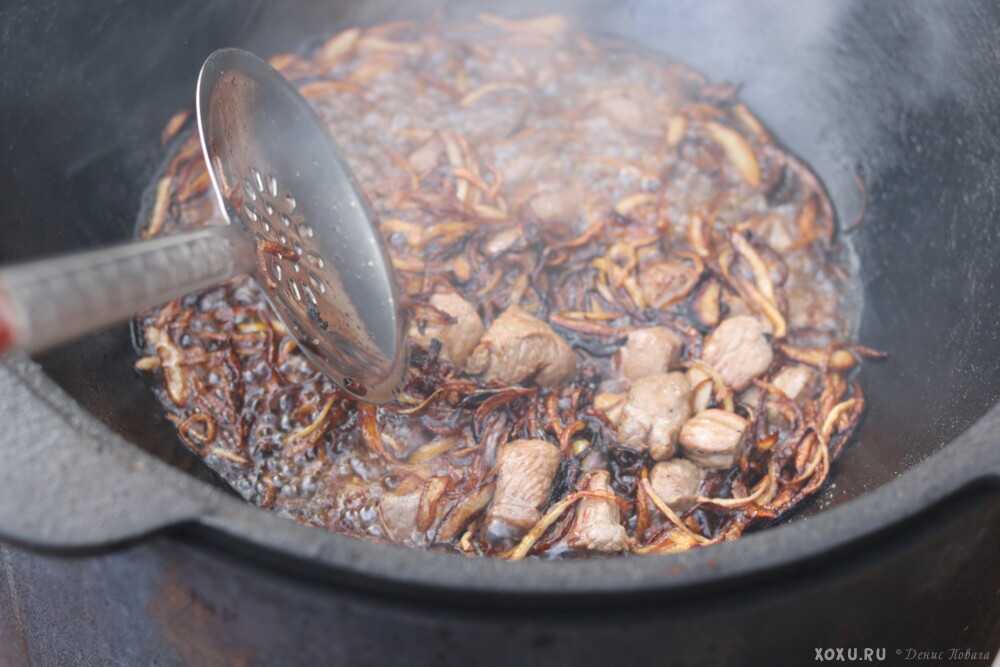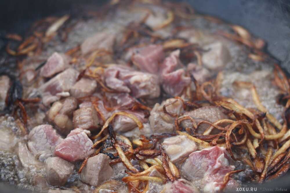 Мясо тем временем жарится, и пропитывается ароматами жженого лука. Аромат стоит потрясающий!