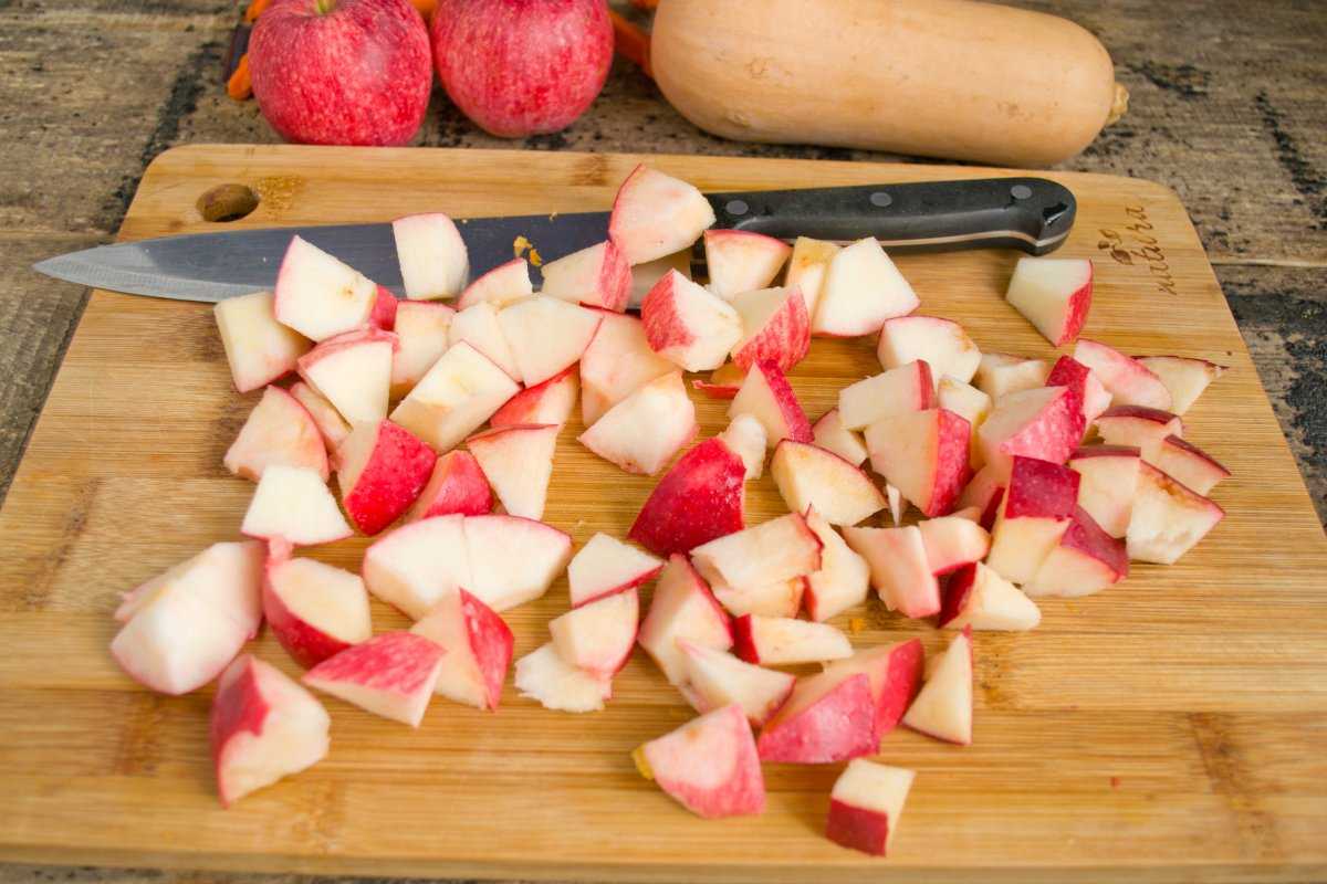В это время яблоки нарезаем такими же кусочками, как и тыкву. Но можно поиграть со структурой будущего варенья – тыкву нарезать покрупнее, а яблоки — мельче, или наоборот.