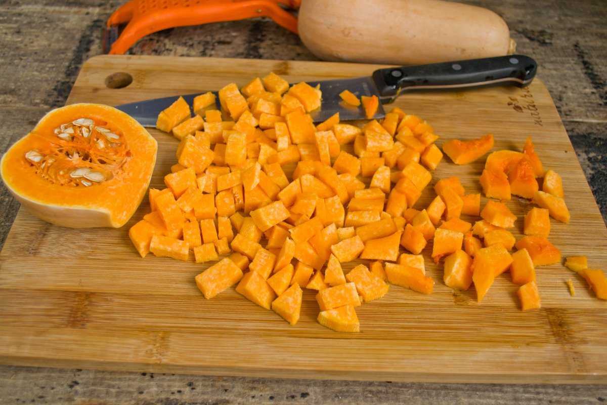 Тыкву очищаем от кожуры, убираем семечки, вырезаем волокнистую часть мякоти. Нарезаем мякоть тыквы небольшими кубиками.
