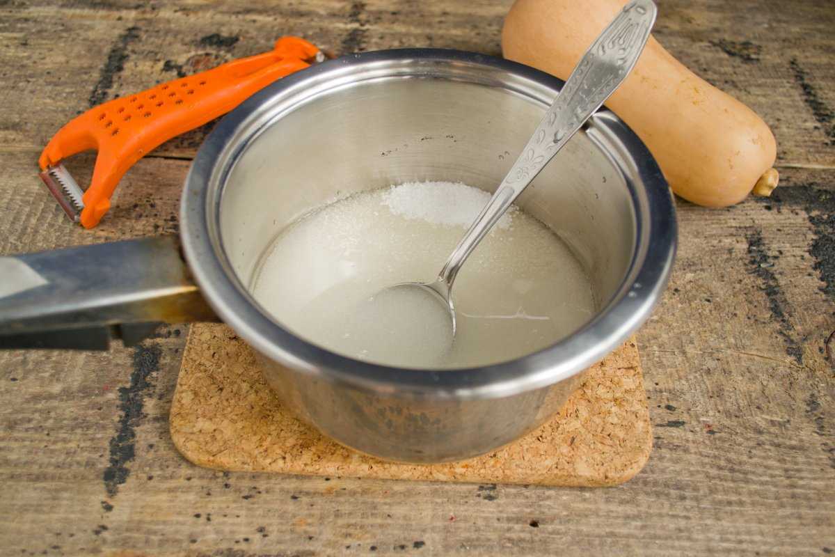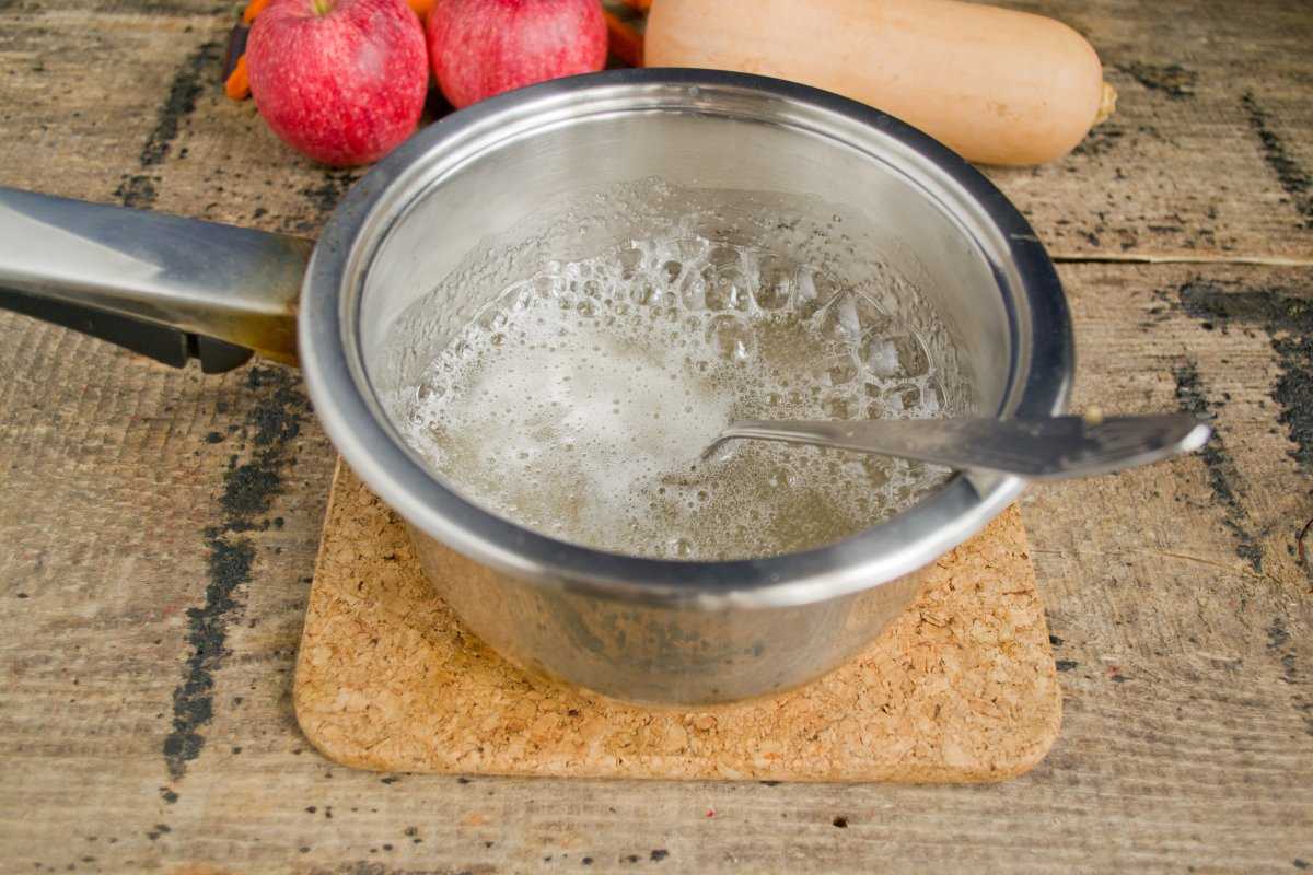 Утром добавляем воду, если выделенной жидкости недостаточно, ставим таз на маленький огонь и нагреваем до кипения.