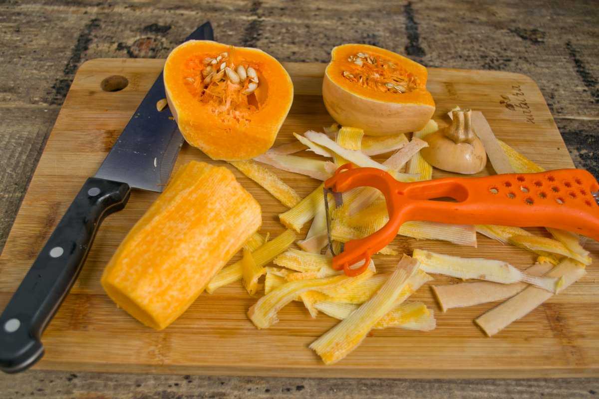 Пока курага в воде, подготовим тыкву. Ее следует прополоскать, срезать с нее кожуру, удалить внутренности и порезать на кусочки среднего размера. Выложить в сотейник, залить водой и поместить на плиту, отварить.