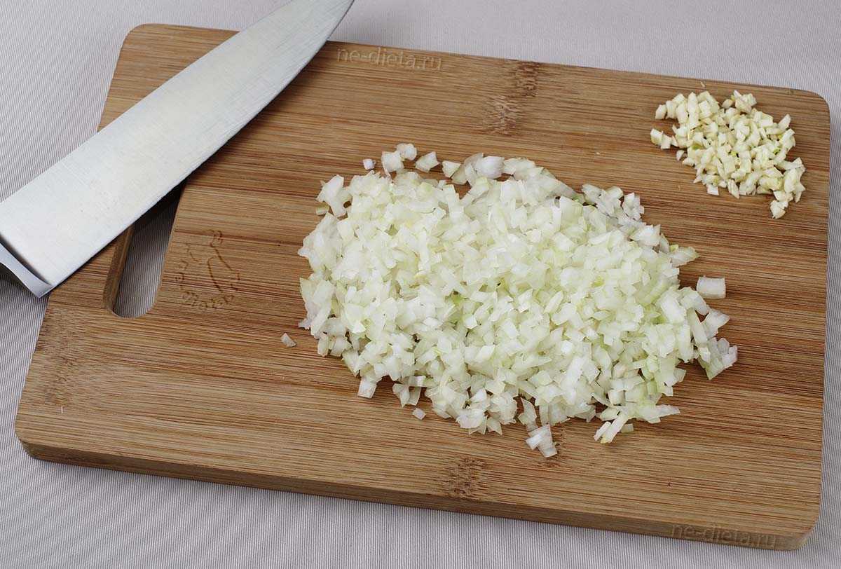 1. Для того чтобы приготовить мексиканские пирожки эмпанадас, репчатый лук и чеснок очистить и мелко нашинковать.