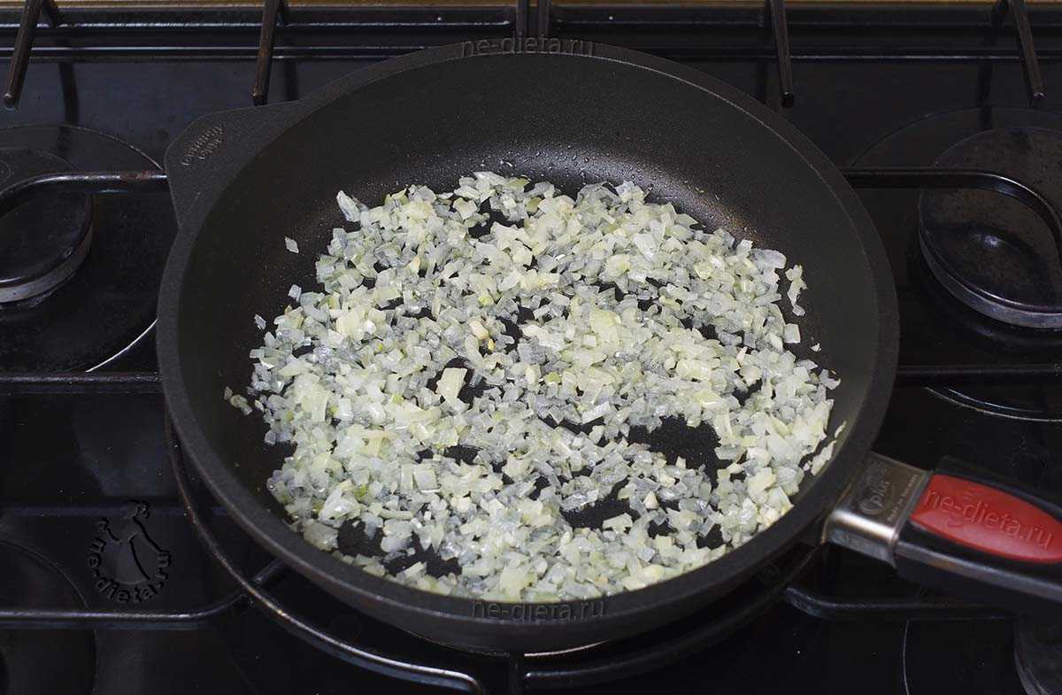 4. Тем временем можете заняться начинкой. Очистите лук репчатый, нарежьте мелкими кубиками и обжарьте его до золотистого цвета.