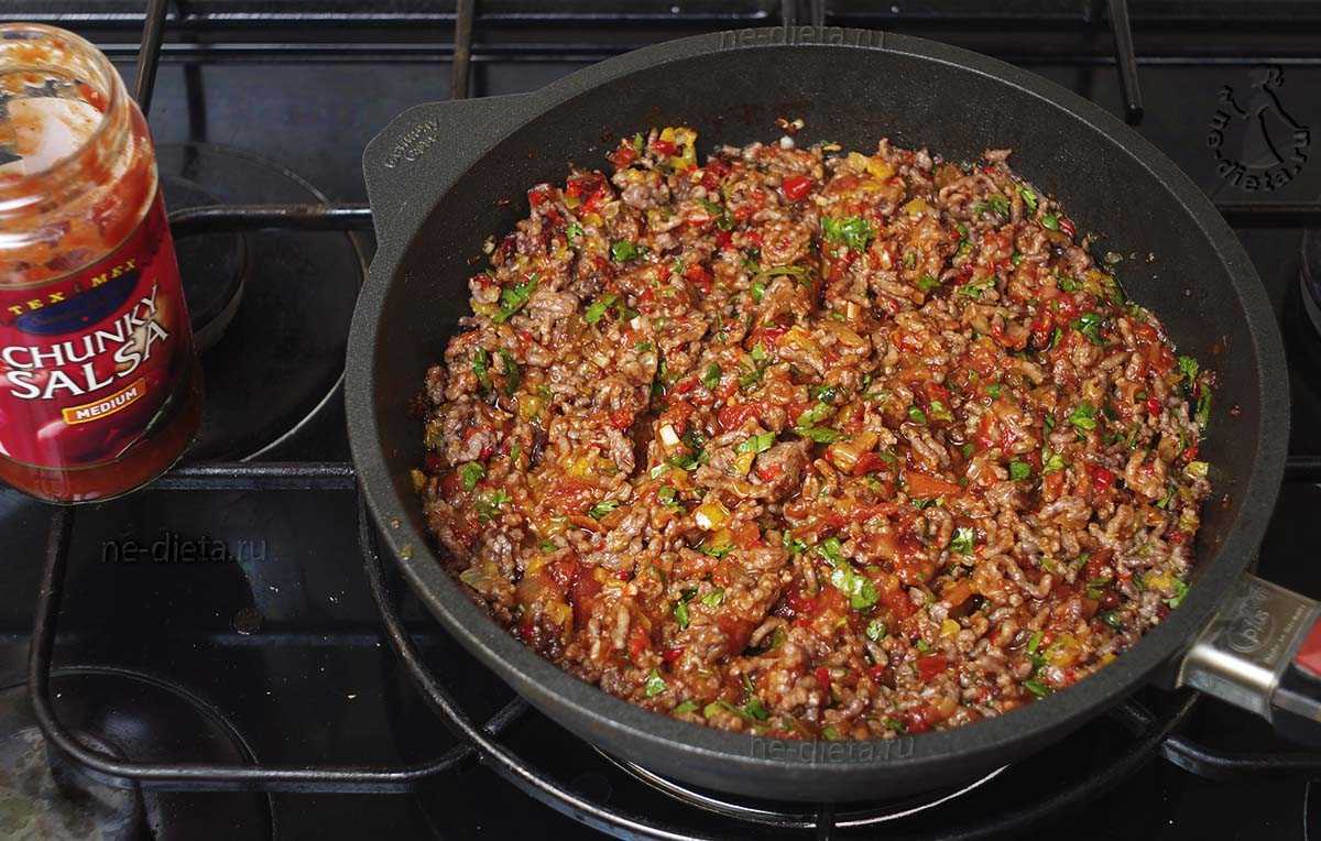 6. Выложить мясной фарш, перемешать и готовить 8 — 10 минут, пока весь фарш не потемнеет. Вылить из сковороды лишнюю жидкость вместе с выделившимся из мяса жиром.