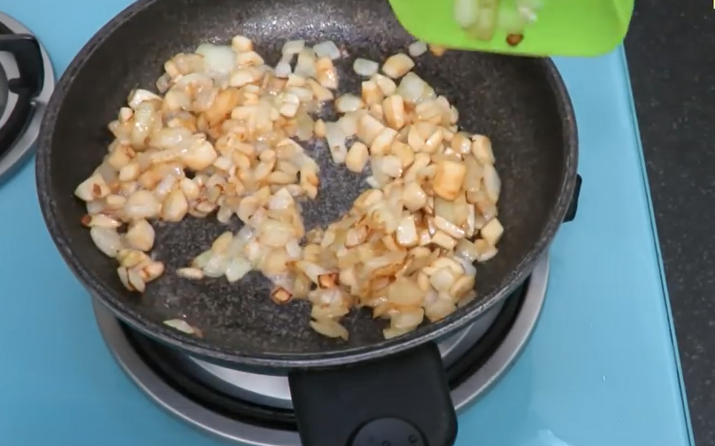 - Шинкуем лук и высыпаем его на разогретую сковороду с маслом.