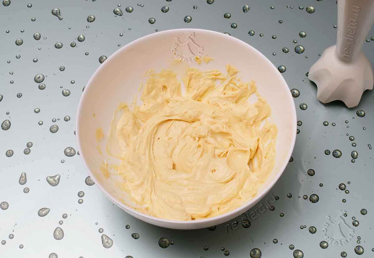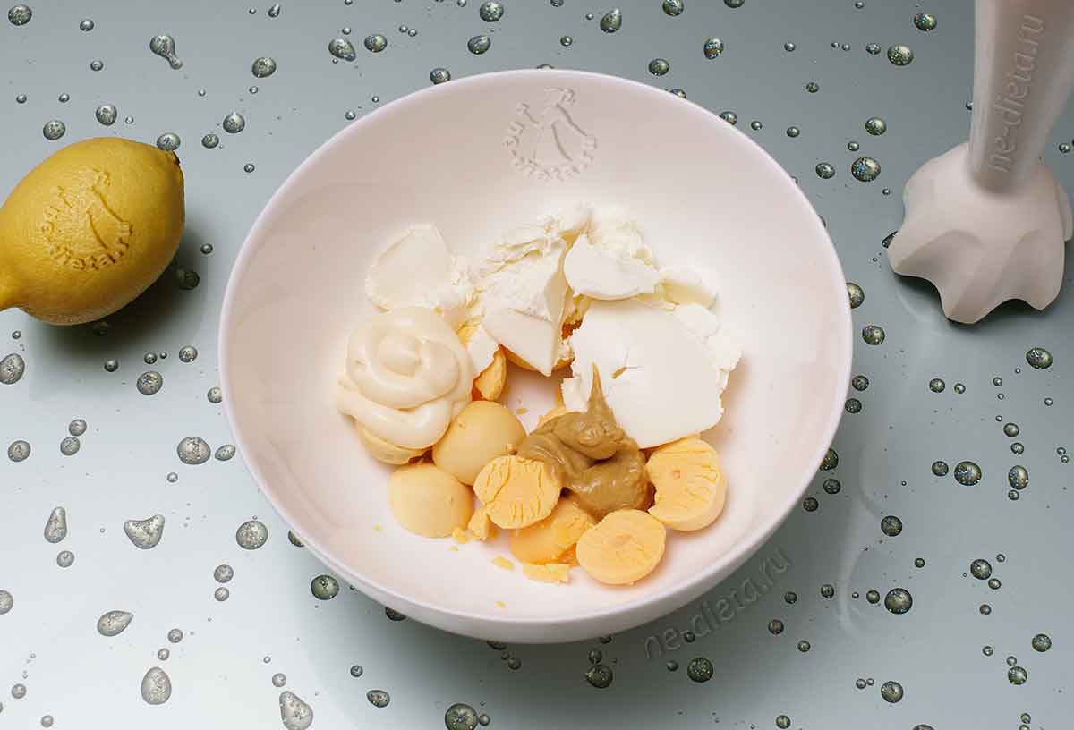 3. К яичным желткам добавить творожный сыр, майонез, горчицу и лимонный сок.