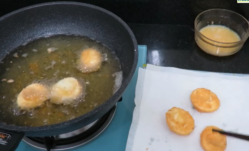 - Обжариваем белки во фритюре до красивого золотистого цвета и выкладываем на салфетки, которые впитают в себя лишний жир.
