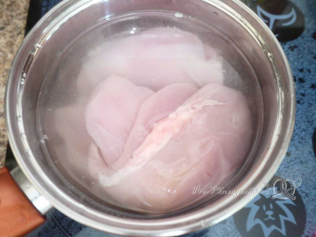 На плиту ставим сотейник с водой и куриным филе (уровень воды должен быть чуть выше мяса), варим на максимальном огне до закипания, затем убавляем до среднего на 20-25 мин (проверяем вилочкой, протыкаем, если сок светлый и нет крови, значит курица готова). Чтобы сохранить максимум пользы, филе птицы лучше опускать в кипящую воду.