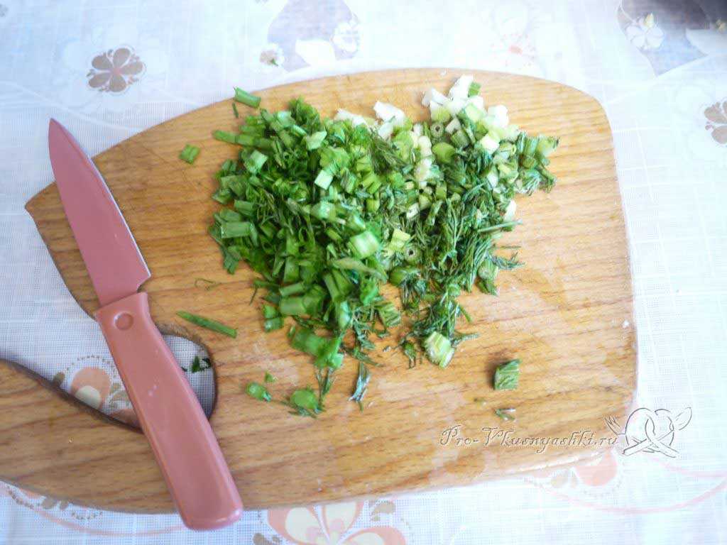 - Для начинки измельчите лук, чеснок, петрушку.