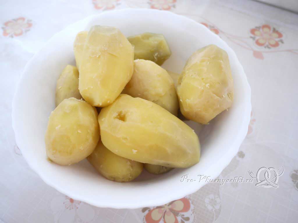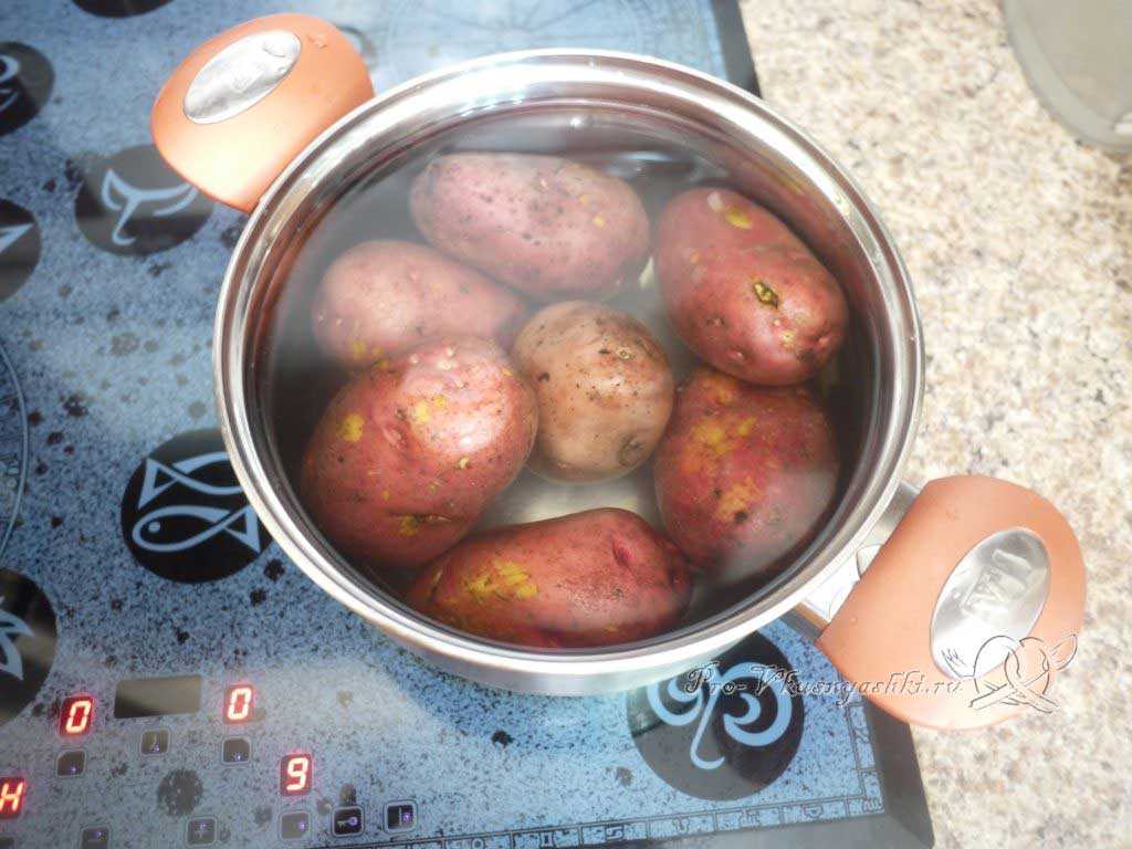 - Отварите картофель в кожуре до полуготовности. Варить примерно 20 минут после закипания.
