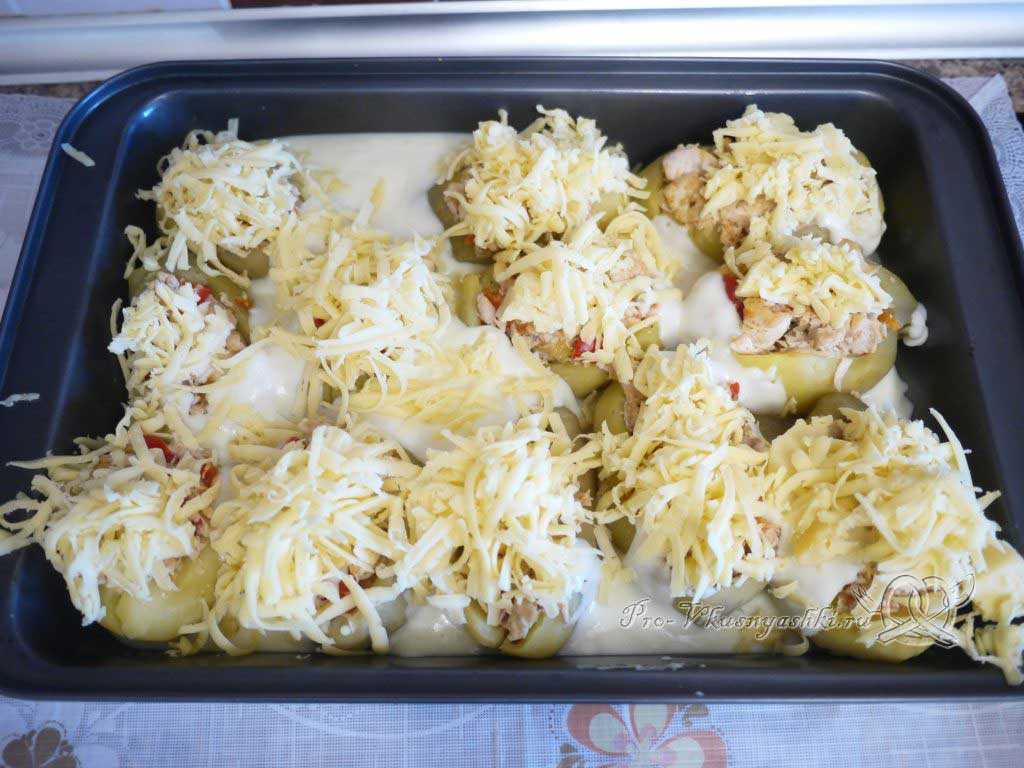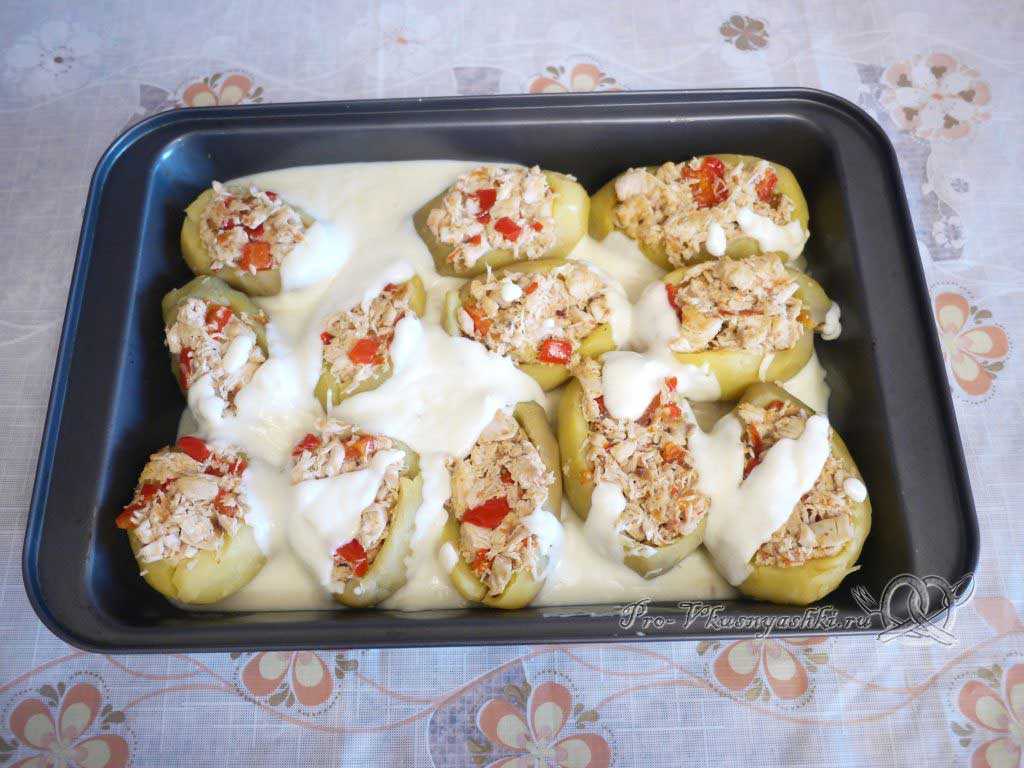 7. выложите фаршированный картофель в небольшую металлическую, стеклянную или глиняную форму. Каждый фаршированный клубень смажьте майонезом, налейте в форму немного воды и поставьте в духовку. Фаршированный картофель должен запекаться в духовке в течение 35-40 минут. Картофель должен приобрести золотистый цвет, а начинка — красивую румяную корочку.