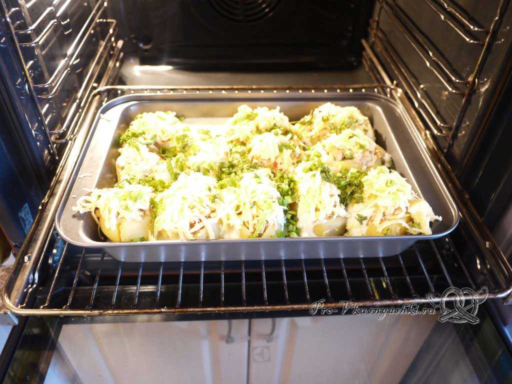 - В форму для запекания поместить все нафаршированные картофелины, на дно формы налить немного воды или куриного бульона. Поставить в разогретую до 200°С духовку на 30 — 50 минут.