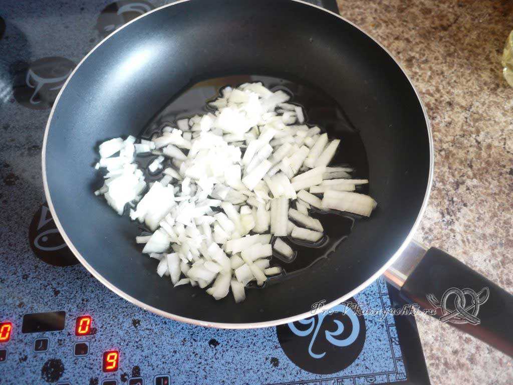- Добавьте масло и лук. Жарьте 2 минуты.