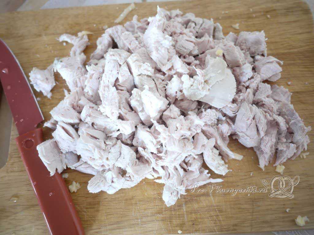 Вместо вареной курицы можно взять копченую, блюдо получится тоже очень вкусное, с ароматом дымка.