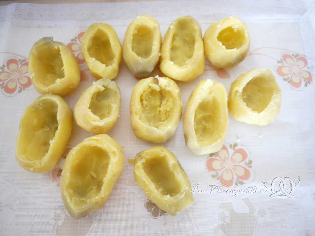 Теперь — самое интересное. Достаем из духовки картофель, ждём пока он немного остынет, разрезаем его пополам по длинной стороне и при помощи ложки из каждой картофелины аккуратно вынимаем мякоть таким образом, чтобы каждая картофелина приобрела форму лодочки. Желательно эту операцию производить быстро, чтобы не совсем сильно остыл картофель.