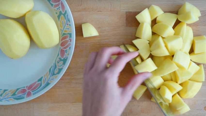 2. Картофель почистите, нарежьте и залейте холодной водой, чтобы не потемнел.
