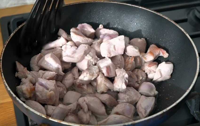 - 400 гр филе без кожи нарезается довольно крупным кубиком и обжаривается на растительном масле до образования корочки.