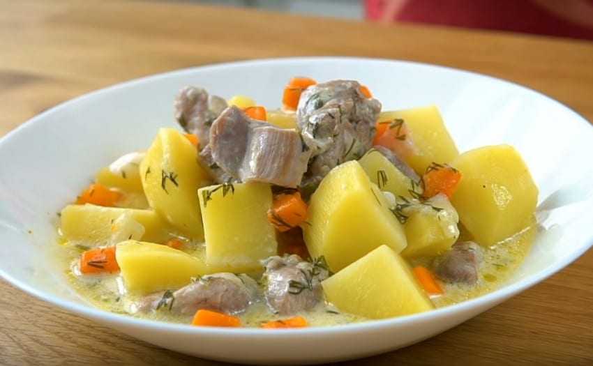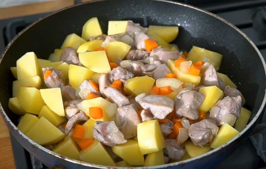 - В сотейник к мясу добавляется 800 гр молодого картофеля очищенного и порезанного аналогичным способом, а также 200 гр нашинкованной капусты. Все заливается водой так, чтобы она доходила до верха ингредиентов, доводится до кипения. Закрывается крышкой, и тушится на медленном огне в течение 20 минут.