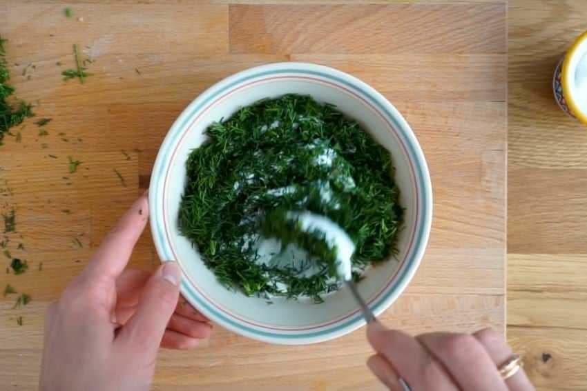 4. Смешайте сметану, чеснок и зелень, немного посолите.