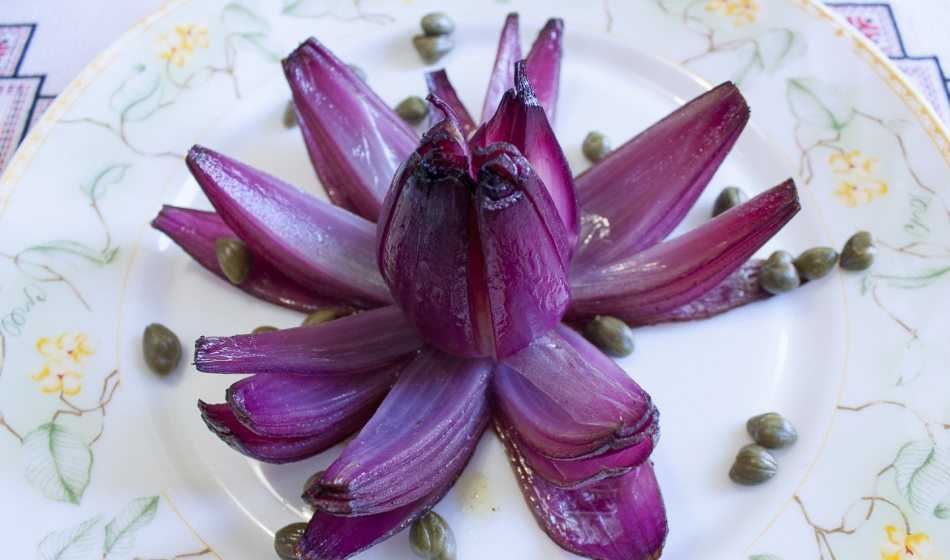 режется только кольцами, кольца кладутся либо поверх всех овощей, либо чередуясь с ними. Украсить нарезку можно пучком свежих перьев лука, которые легко сгибаются, укладываются, делают узор.