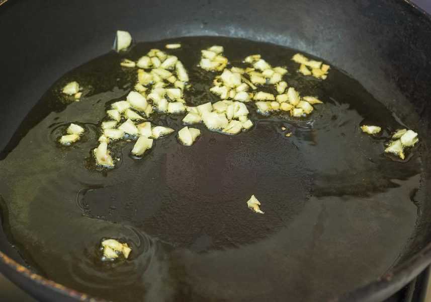 1. Чеснок очищаем и режем на мелкие кусочки, кладем на сковороду с маслом и разогреваем.