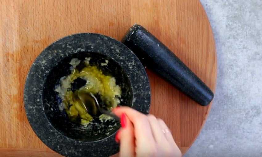 3. В емкость поместите нашинкованный чеснок, соль и растолките до состояния кашицы. Добавьте оливковое масло для вкуса. Хорошо перемешайте смесь.