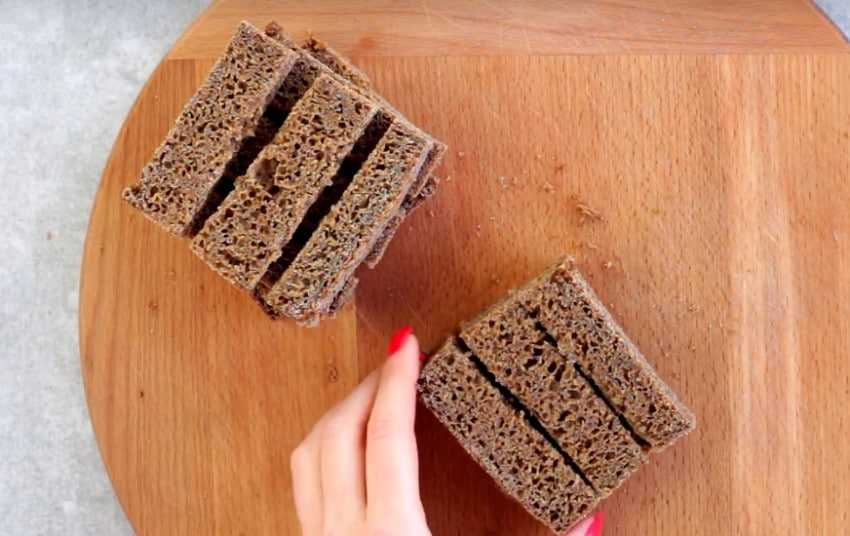 1. У бородинского хлеба срежьте корки со всех сторон. Разрежьте их на кубики 1,5 см х 1,5 см.
