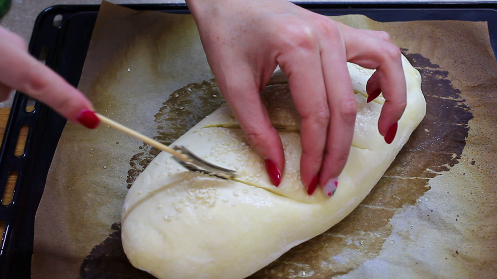 Выросшее тесто аккуратно переверните на противень, застеленный пергаментом.