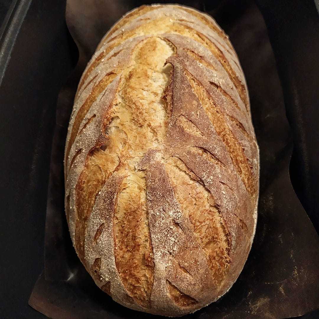 Когда вы создадите пар в последний раз, уменьшите температуру духовки до 200 градусов и пеките буханку до образования корочки интенсивного румяного цвета.