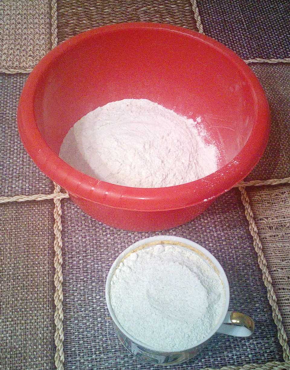 Для начала нужно взять муку и соль (пшеничная — 3 стакана, ржаная — 2 стакана, соль — 1 чайная ложка) и пересыпать их в емкость в которой вы будете вымешивать тесто. Многие в интернете рекомендуют муку просеивать через сито, чтобы она напиталась кислородом. Но я так не делаю.