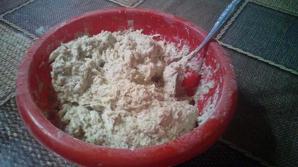 - Все хорошенько перемешайте до однородной массы. Дайте тесту минут 20 постоять и еще раз вымешайте, чтобы оно лучше обогатилось кислородом. Если вы замешиваете тугое тесто с большим количеством муки, тогда делайте это опять же до однородности, смазывая руки маслом, водой или присыпая мукой.