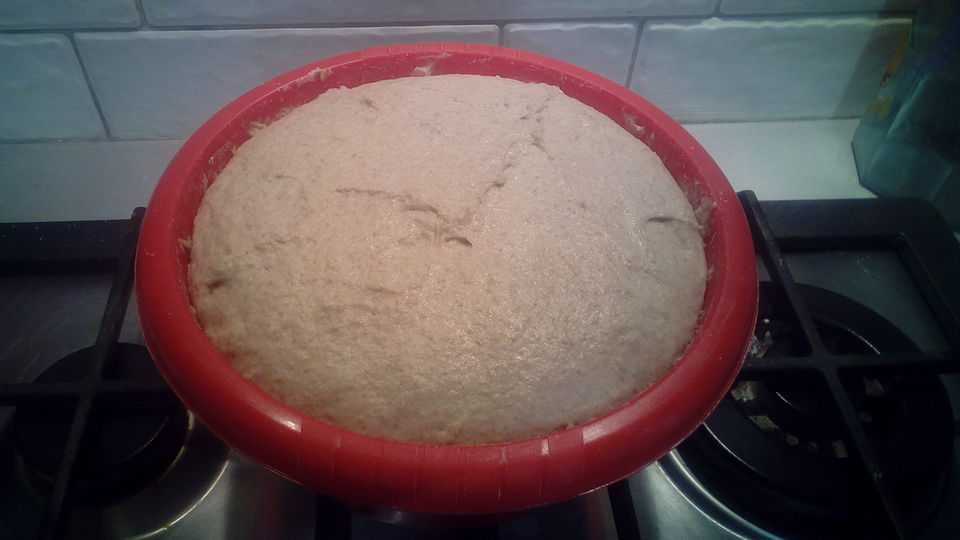 - Выложите тесто в смазанную форму или застеленную пекарской бумагой. Промасленными руками или ложкой разровняйте поверхность, сверху накройте форму, чтобы тесто не подсыхало и оставьте его подходить на 3-4 часа в теплом месте (я ставлю в слегка теплую духовку). Если закваска молодая, то тесто увеличится в два раза часа через 4, если зрелая, то может и раньше. Но если оно перестоит, вы заметите глубокие дырочки на поверхности, тогда испеченная булка будет с просевшей корочкой. А если не достоит, тогда хлеб будет тяжелый, плохо пропеченный. Однако, чем чаще вы будете печь, тем быстрее поймете весь принцип и будете действовать по интуиции, не смотря на часы.